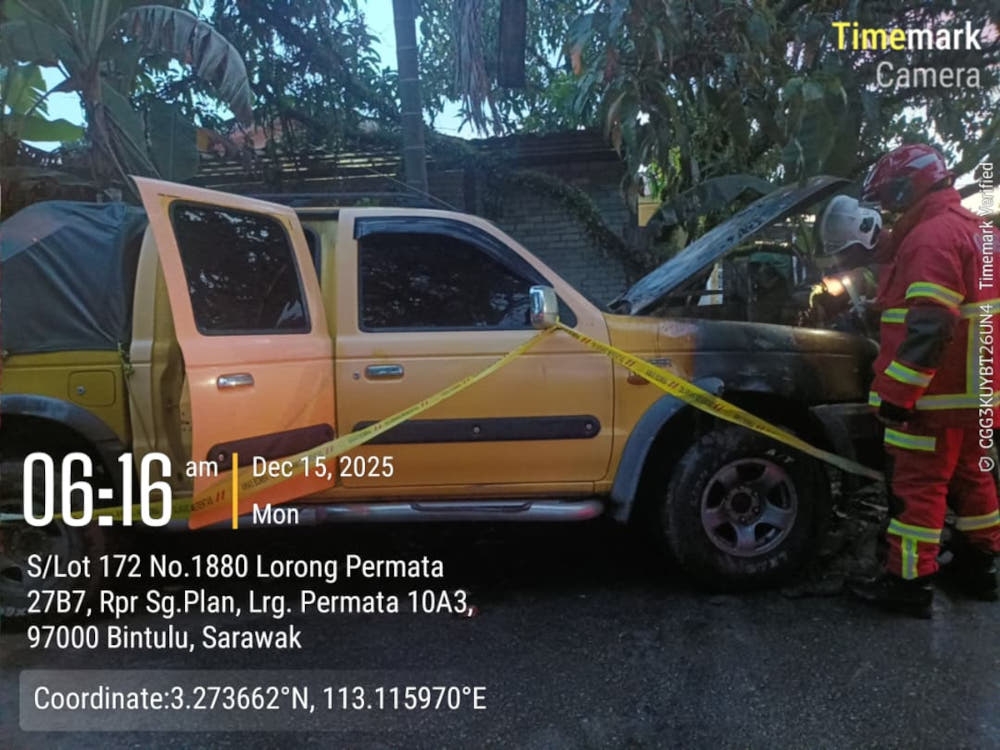 BINTULU, Dec 15 — A pickup truck caught fire in the early this morning at RPR Sungai Plan, Jalan Tanjung Kidurong. The Fire and Rescue Department (Bomba) said an emergency call was received at 5.59am and firefighters from the Kidurong fire station were immediately dispatched to the scene. “When firefighters arrived, they
